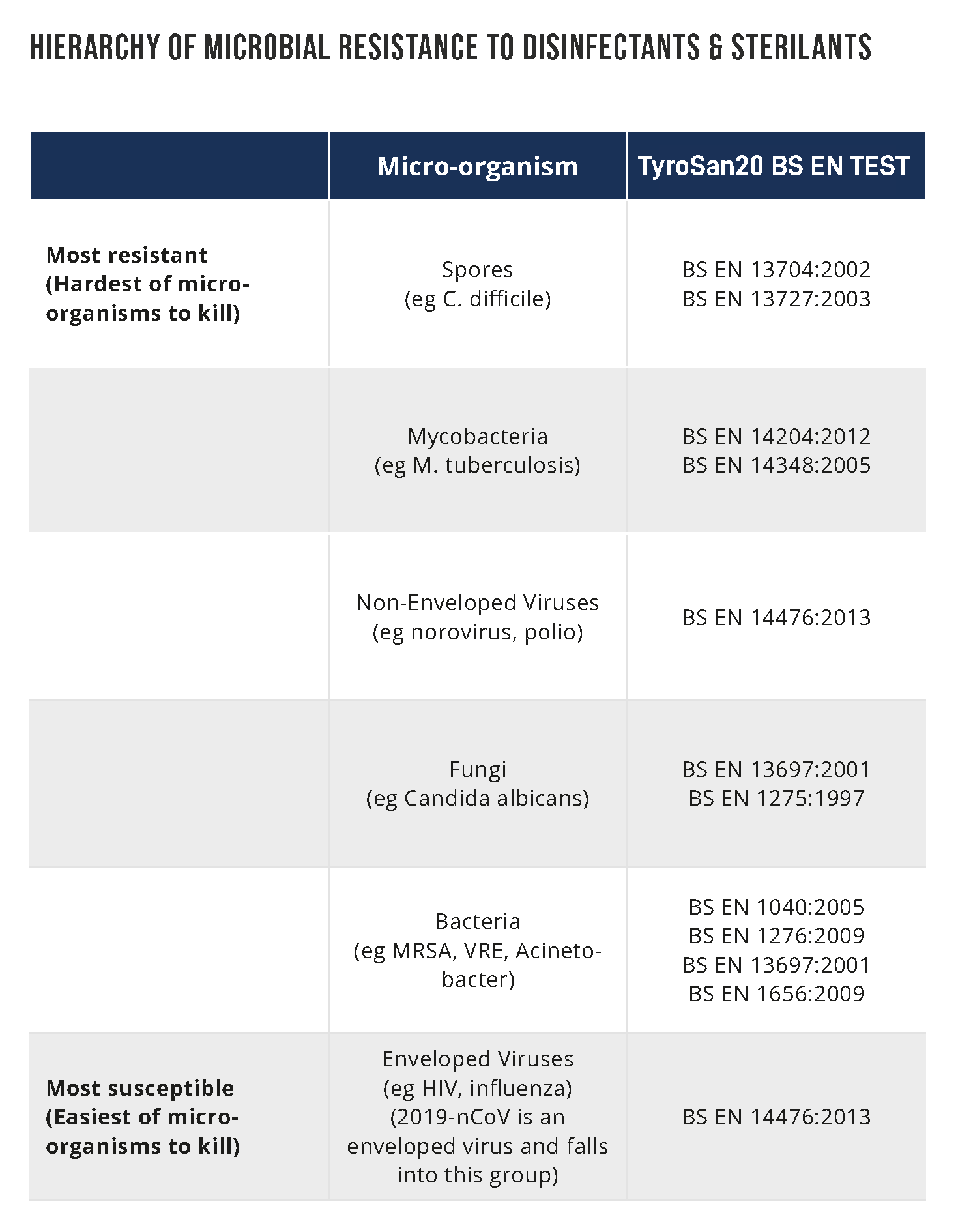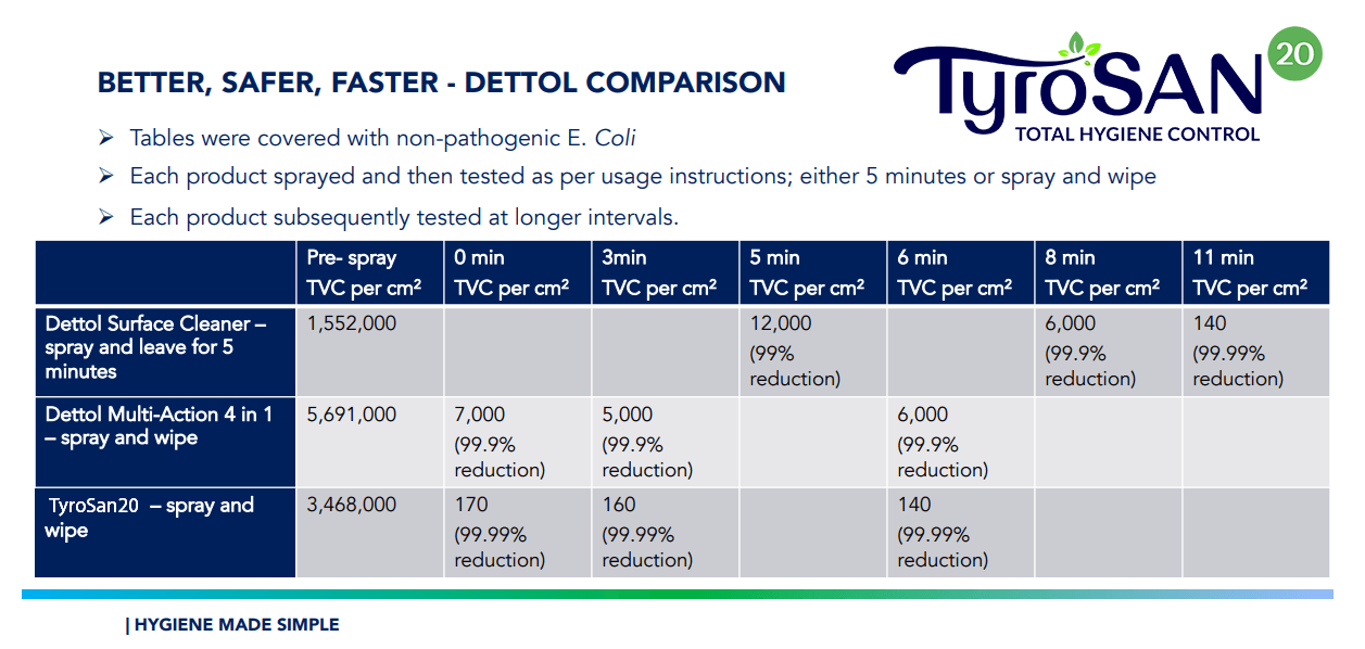 You can have full confidence that TyroSan20 has been manufactured in the optimum range “Goldilocks Zone” for purity, efficacy, safety, and stability. The research, development and manufacture of our product has been evaluated against the strictest Public Health standards and is an approved Safer Space product. The TyroSan20 difference can be summarised as follows: