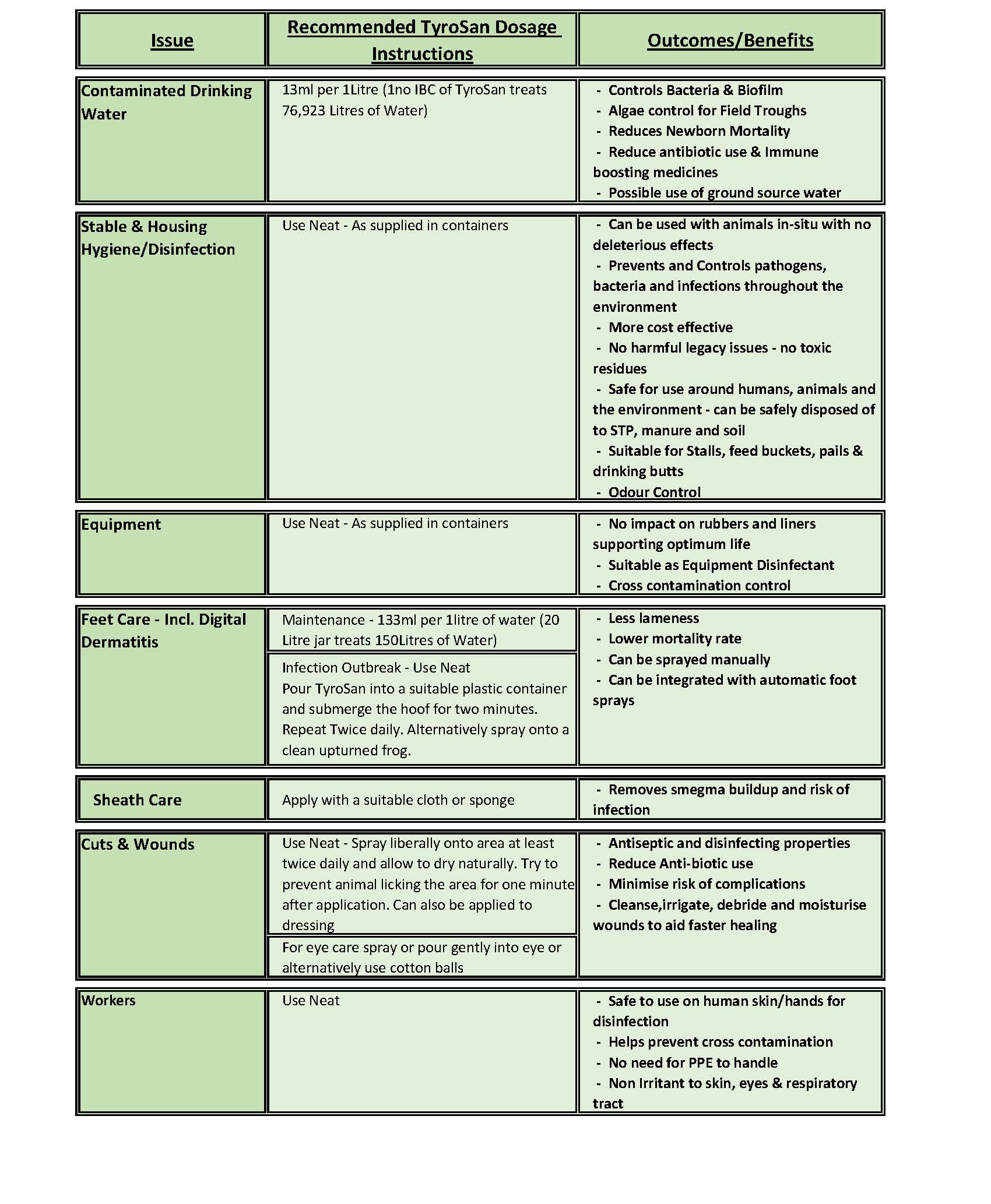 TyroSan20 EQUINE is highly effective in killing all types of pathogens, on contact, both directly on the animal and for terminal disinfections of housing units. Can also be used to treat animal drinking water safely and effectively.