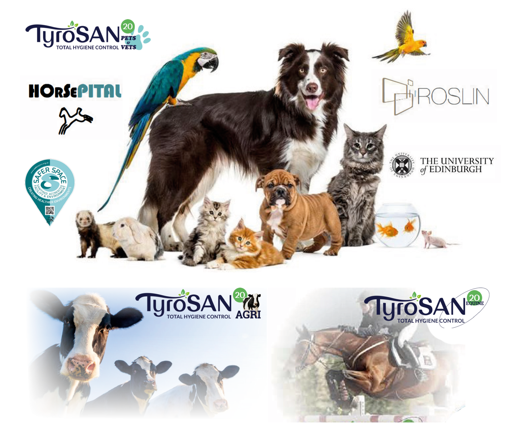 TyroSan20 is highly effective in killing all types of pathogens, on contact, both directly on the animal and for terminal disinfections of housing units. Can also be used to treat animal drinking water safely and effectively. TyroSan is a multi-purpose product that simultaneously improves environmental Biosecurity and animal health. Independently tested and clinically proven to EN Standards including EN1276 (Bactericidal), EN 14476 (Yirucidal), EN 13697 (Fungicidal) and EN 13704 (Sporicidal). Approved for Parts 1- 5 use by ECHA as part of the European Biocidal Products Regulations. Widely used within the University of Edinburgh Veterinary Hospital, The Roslin Institute & The Horsepital Madrid.
